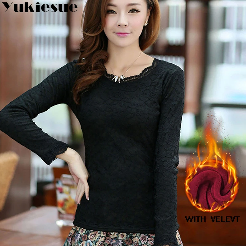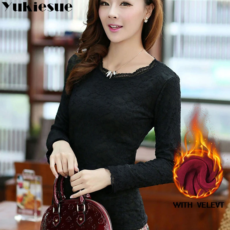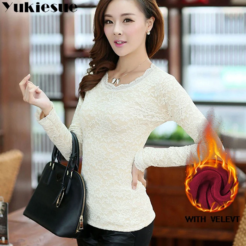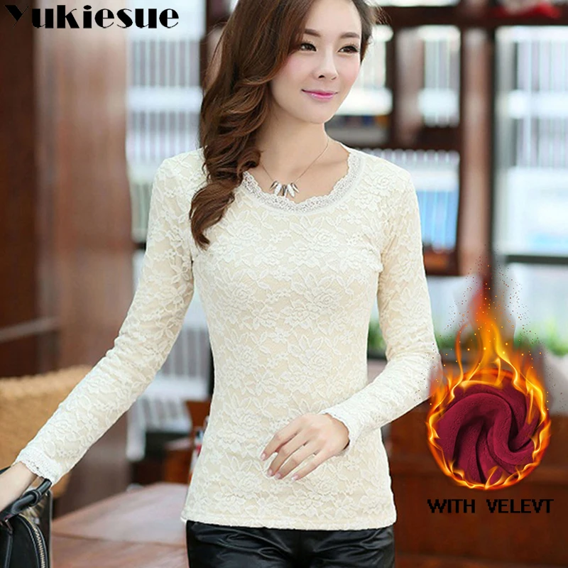 Best sexy white lace blouse shirt Women tops elegant winter warm fleece blouse Summer tops female blouse