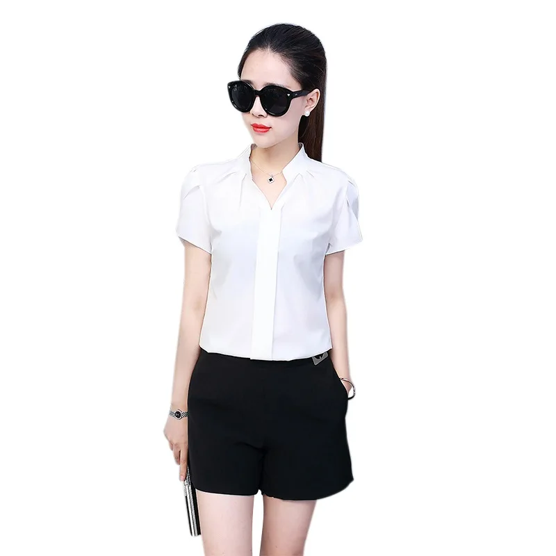 Best Women V Neck Chiffon Blouse Short Sleeve Solid Color Shirt Large Sizes Bodycon Elegant Ladies Autum