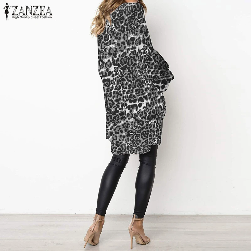 Promo ZANZEA Women's Tunic Blouse Female Sexy Puff Sleeve Asymmetrical Tops Shirt Casual Leopard Grain Bl