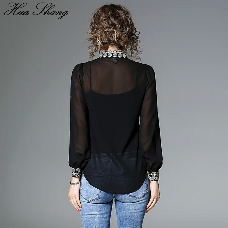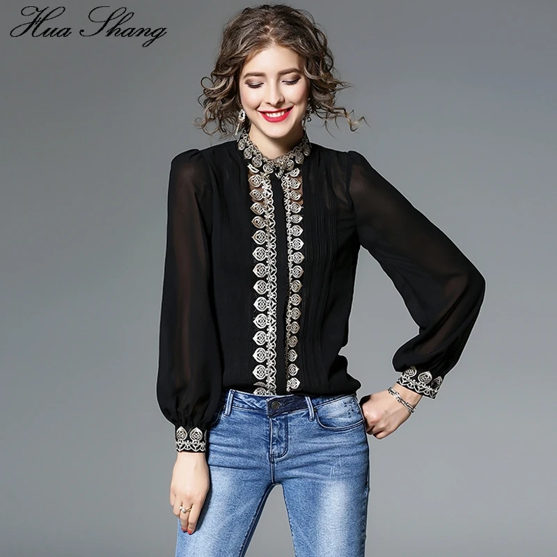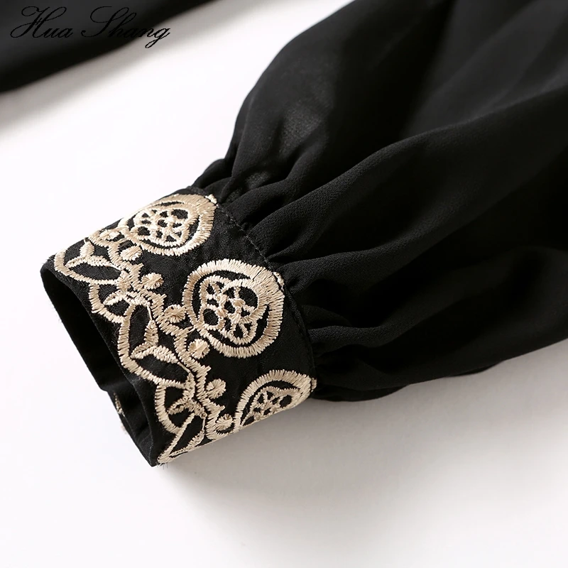 Promo Fashion Women Summer Chiffon Blouse Elegant Stand Collar Lanter Long Sleeve Embroidery Shirt White