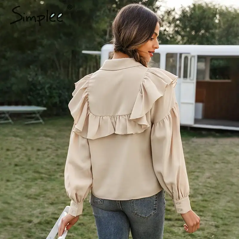 New Simplee Vintage ruffled women blouse shirt Elegant lantern sleeve buttons female tops shirts Autumn