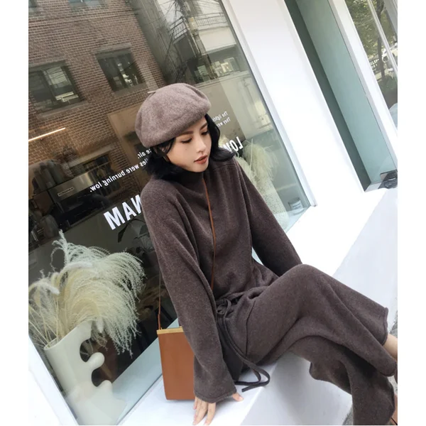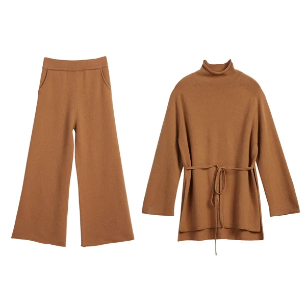 Best 2019 winter knitted women suit 2 piece set solid color turtleneck sweater knitted pants suit pullov