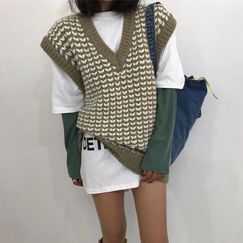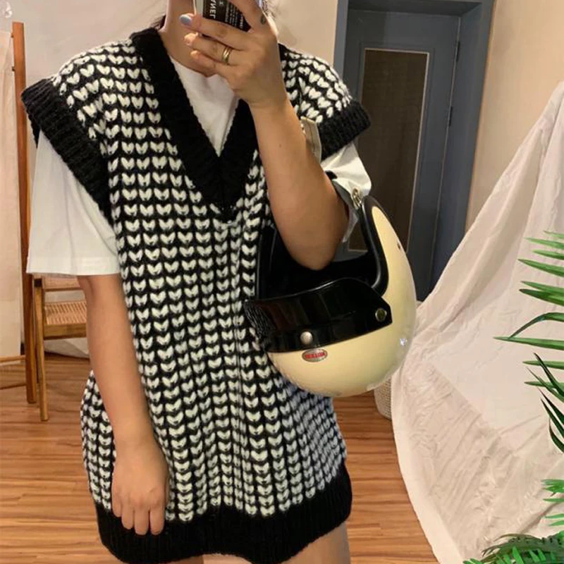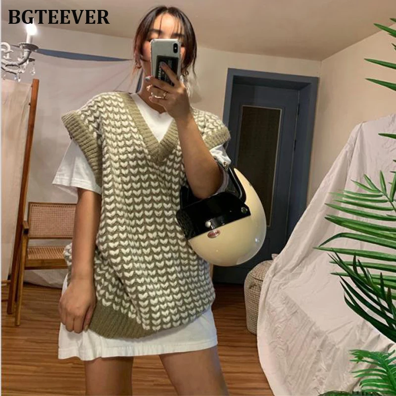Buy BGTEEVER Autumn Winter Thick V-neck Knitted Vest Women Sweater Chic Plaid Knitted Pullovers Femme O