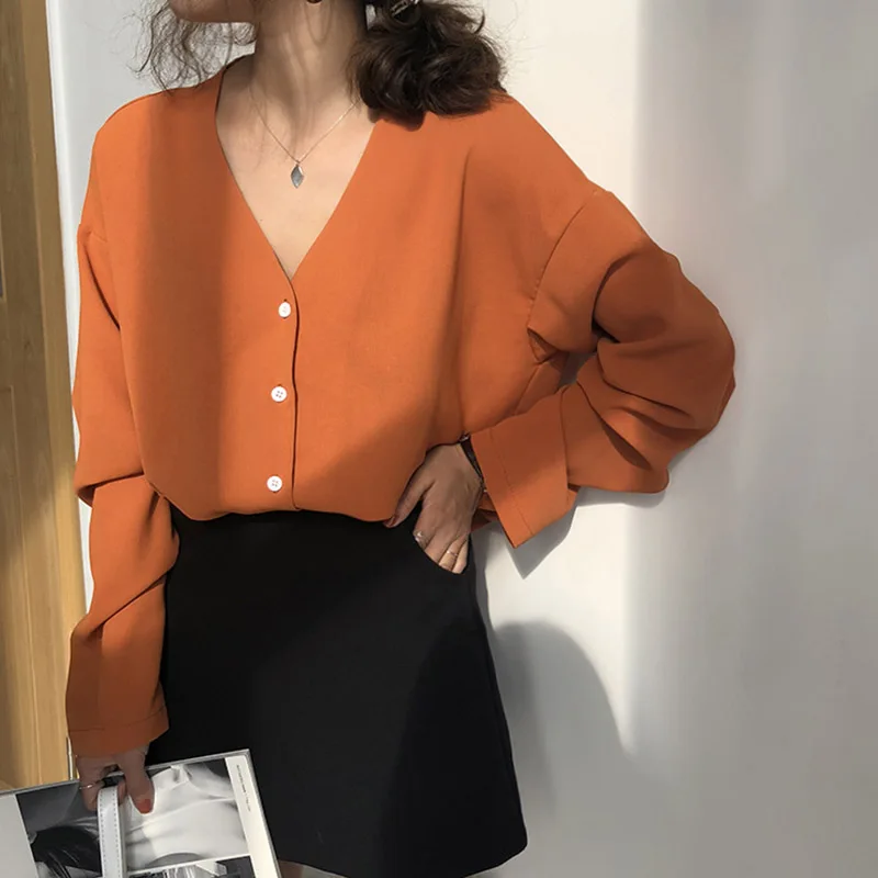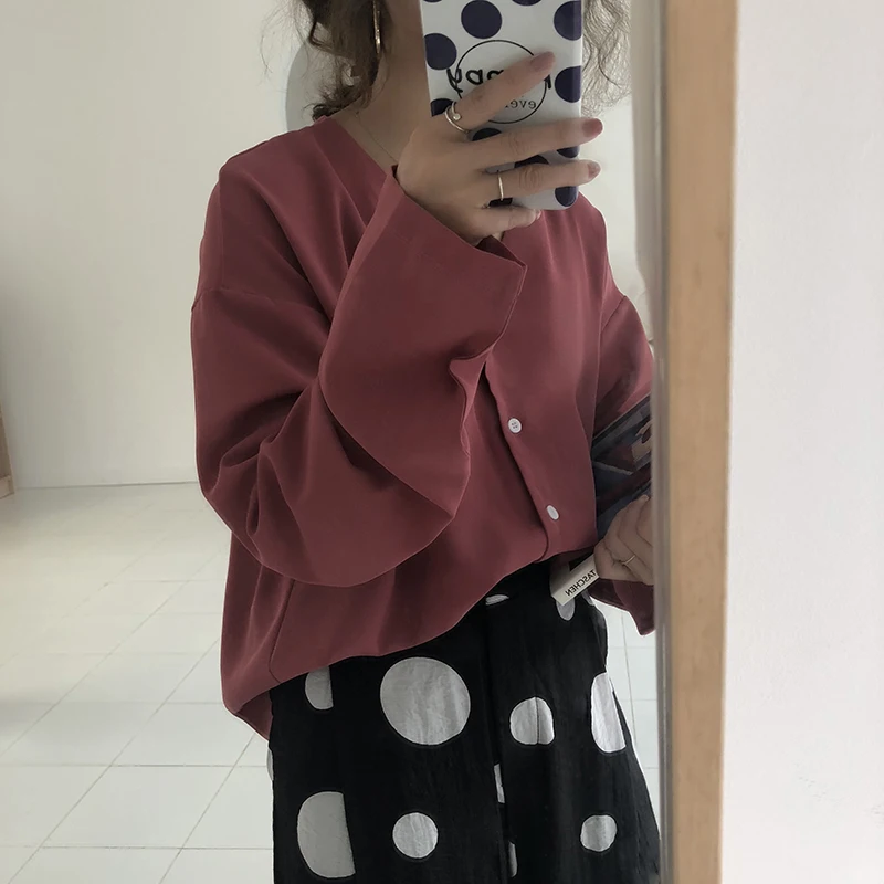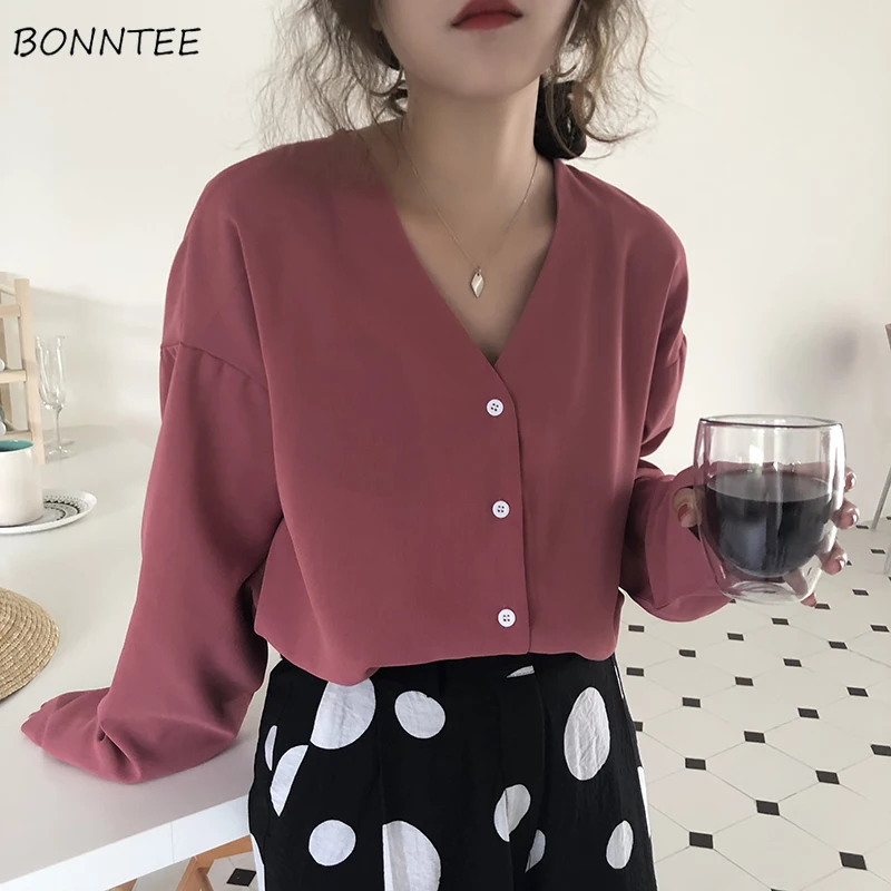 Promo Shirts Women Spring 2019 Trendy Korean Students Retro Blouse Womens All-match Long Sleeve V-Neck El